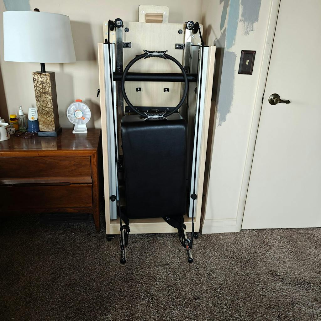 I'm thoroughly impressed with this folding reformer—I absolutely love it! Although it's a bit heavy, I’ll soon build enough muscle to fold and store it easily. Ha! For now, it's set up in my office, looking both sturdy and stylish. My muscles are sore, but I couldn't be happier with this investment.